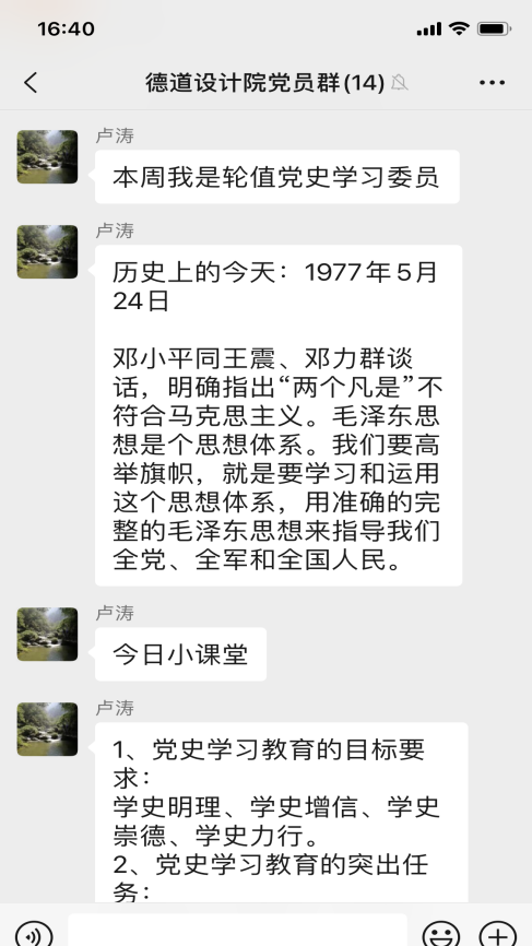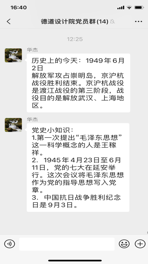近日,為提升學史學習教育的實效性,設計院支部創新思路,結合工作的特殊性,以“黨員學習群”為載體,開展“輪值學習委員領學”活動,排出學習委員輪值表,支部委員帶頭,黨員跟上,每周由一名“學習委員”,帶領大家開展黨史線上學習。輪值學習委員在值班日當天利用中午時間,通過微信群,“敲黑板、劃重點”,發布“歷史上的今天”和“今日小課堂”兩個版塊的學習內容?!皻v史上的今天”展示了中國共產黨和新中國成立以來重大事件?!敖袢招≌n堂”每日推送三條黨史學習教育內容,讓支部每個黨員在靈活時間內完成學習,汲取知識。