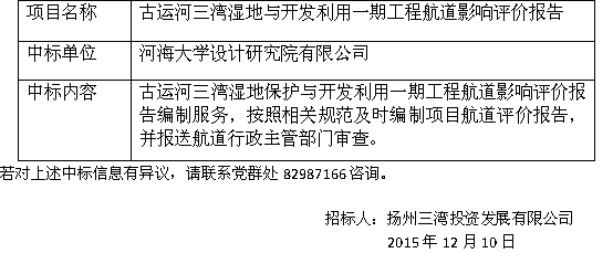 古運河三灣濕地與開發利用一期工程航道影響評價中標公示