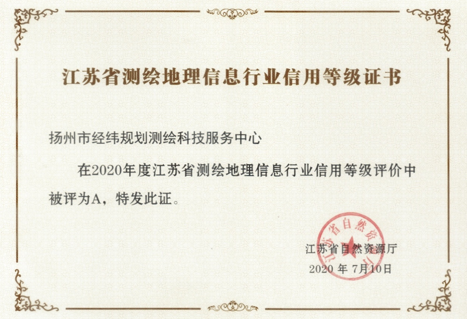 經緯測繪中心榮獲2020年度江蘇省測繪地理信息行業A級信用