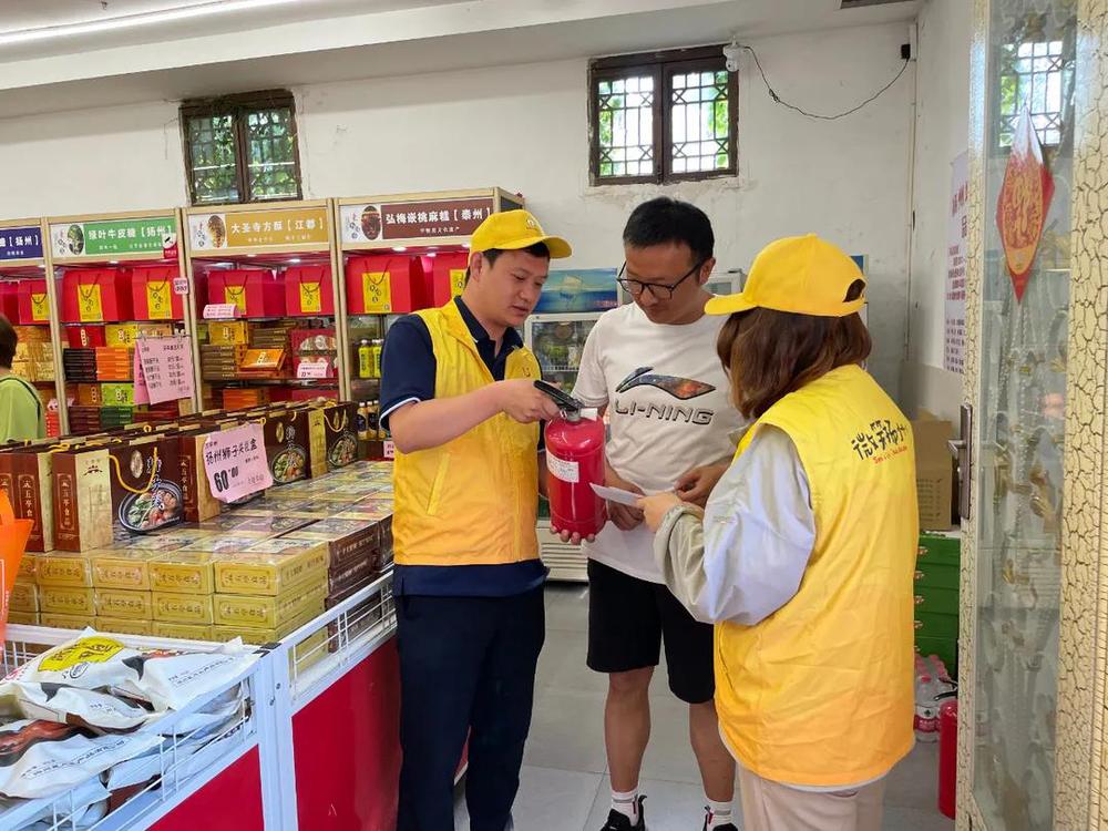 活動中,支部年輕黨員同志深入景區店鋪內宣傳消防安全知識,介紹滅火器的使用方法,發放滅火器使用說明。宣傳員現場手把手示范滅火器的使用方法和注意事項,耐心的向店員傳授如何正確報警、初起火災如何撲滅、用火用電注意事項,發生火災后如何進行自救逃生等內容,切實保障自己的生命和財產安全。