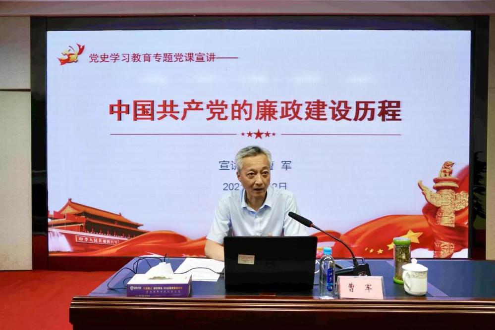 曹軍以《中國共產黨的廉政建設歷程》為題,從新民主主義革命時期的廉政建設、社會主義革命和建設時期的廉政建設、改革開放和社會主義現代化建設新時期的廉政建設、中國特色社會主義新時代的廉政要求四個階段,學習回顧了中國共產黨廉政建設的歷史經驗,結合當前反腐倡廉形勢分析了問題,對下一步反腐敗工作提出了要求。