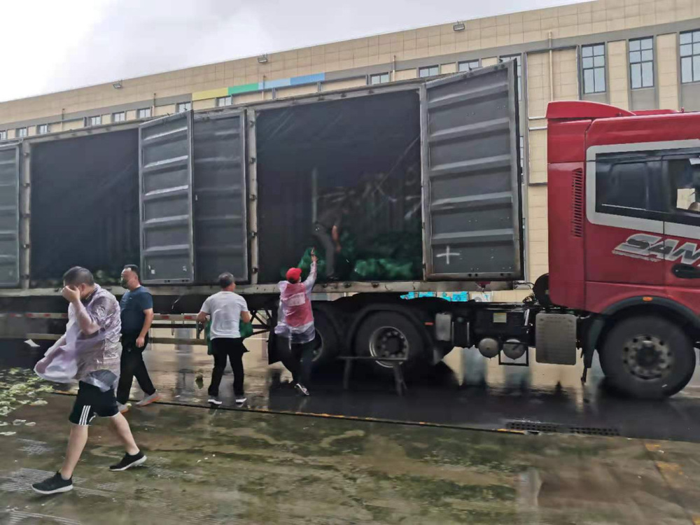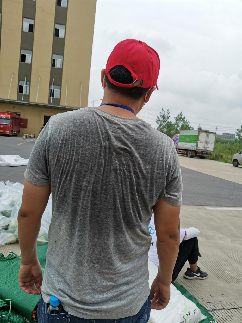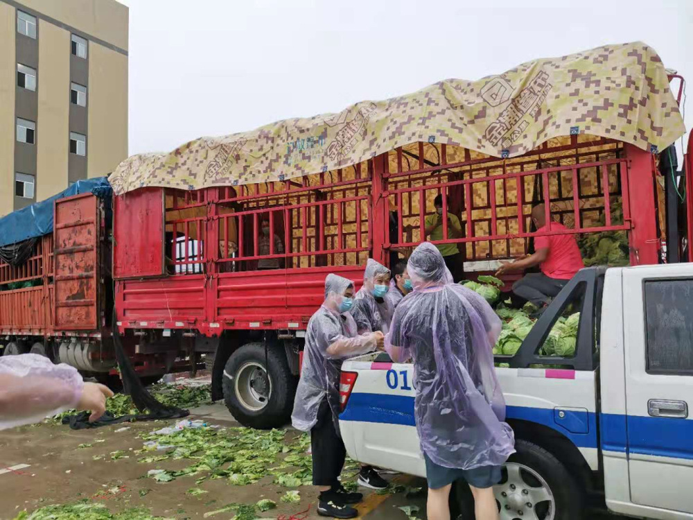 14:30,天空開始飄起雨點,大家依舊堅守在各自的崗位上,很快雨點就打濕了衣服和頭發,可現場沒有一個人退下躲雨?!斑@車卸得差不多了,我們去那邊幫忙”,“邗江區轉運蔬菜的車來了,需要10個人裝車”,“我去”“我也去”,現場只有時不時這樣的聲音傳來。