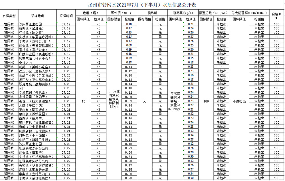 揚州市管網水2021年7月(下半月)水質信息公開表