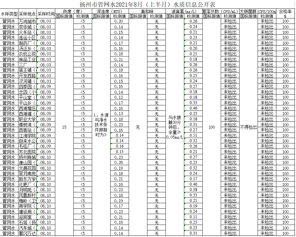 揚州市管網水2021年8月(上半月)水質信息公開表