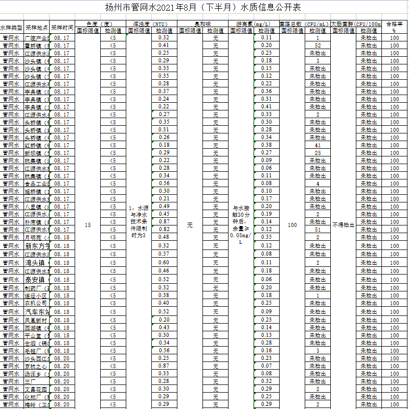 揚州市管網水2021年8月(下半月)水質信息公開表