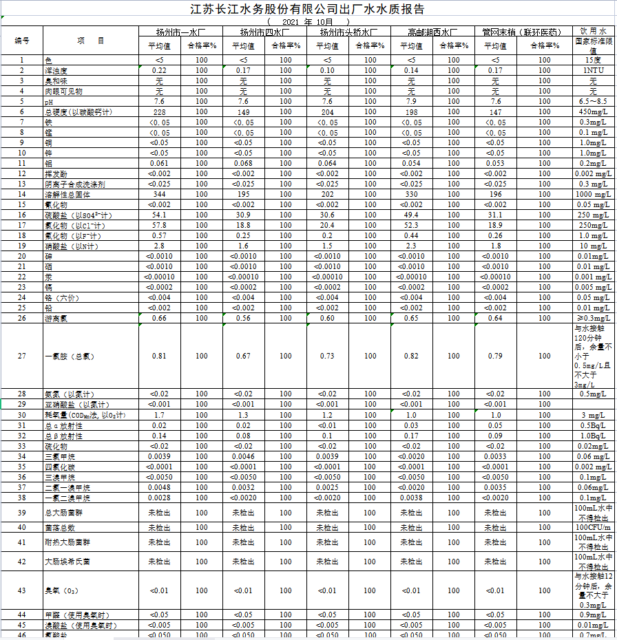 江蘇長江水務股份有限公司出廠水水質報告 (2021 年 10月)