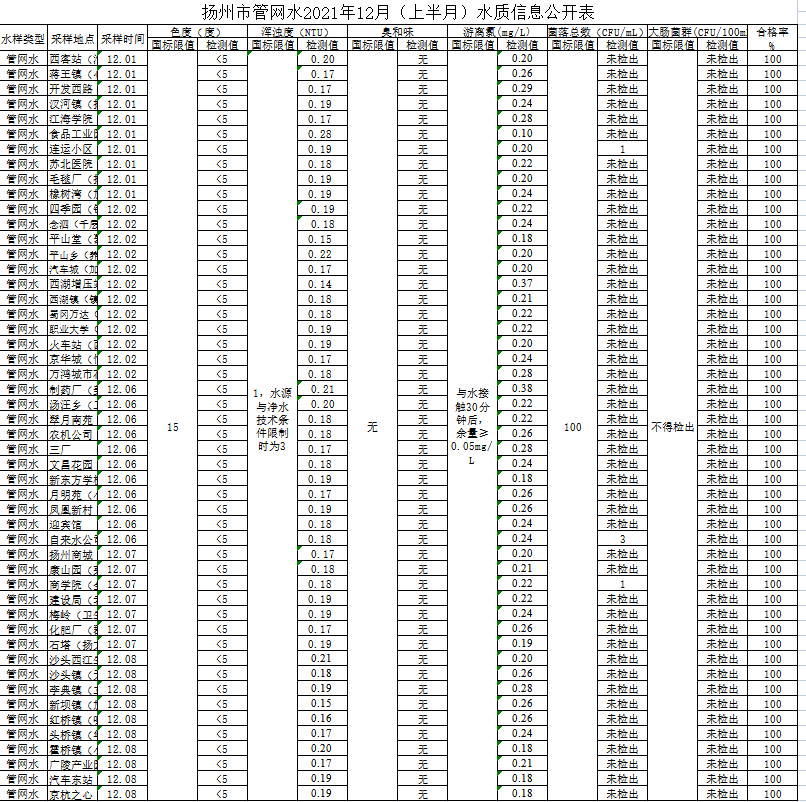 揚州市管網水2021年12月(上半月)水質信息公開表