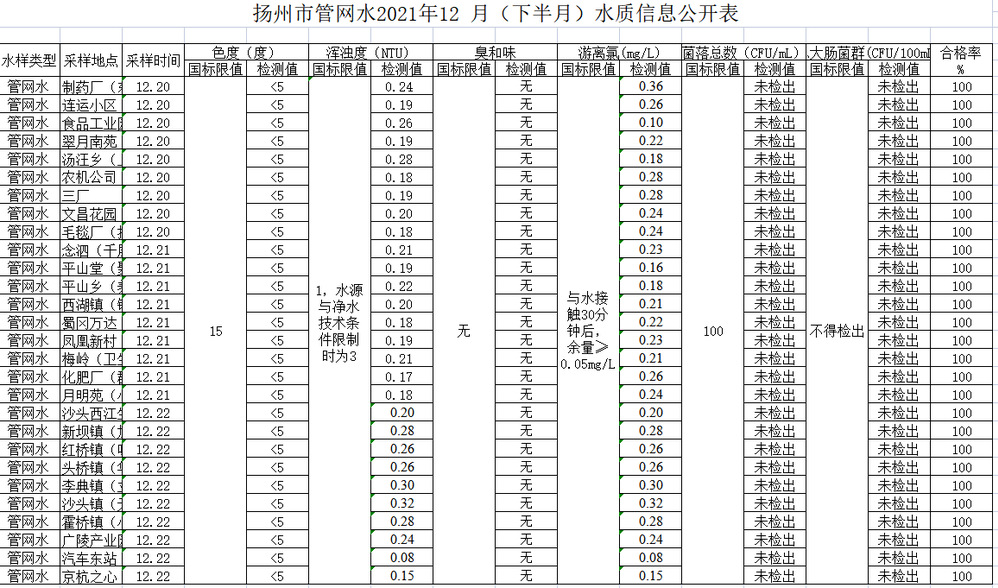 揚州市管網水2021年12 月(下半月)水質信息公開表