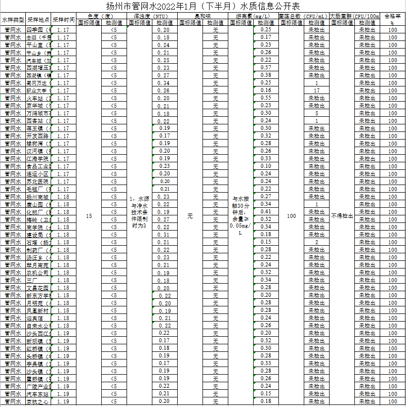 揚州市管網水2022年1月(下半月)水質信息公開表