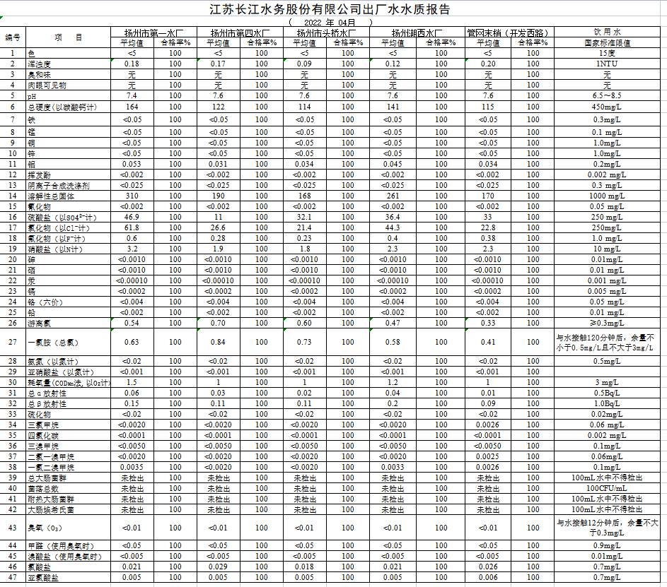江蘇長江水務股份有限公司出廠水水質報告 ( 2022 年 04月 )