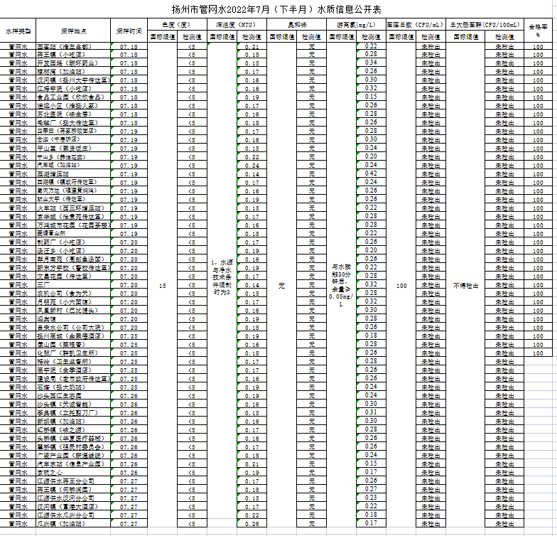 揚州市管網水2022年7月(下半月)水質信息公開表