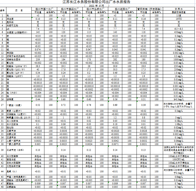 江蘇長江水務股份有限公司出廠水水質報告 ( 2022 年 07月 )