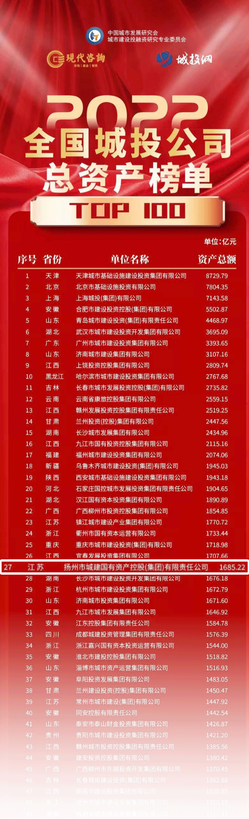9月6日,由中國城市發展研究會城市建設投融資研究專業委員會、江蘇現代資產投資管理顧問有限公司、城市投資網等三家單位聯合發布的“2022全國城投公司總資產情況排行榜”,城控集團以總資產1685.22億元位列27名,較2021年排名實現再提升。