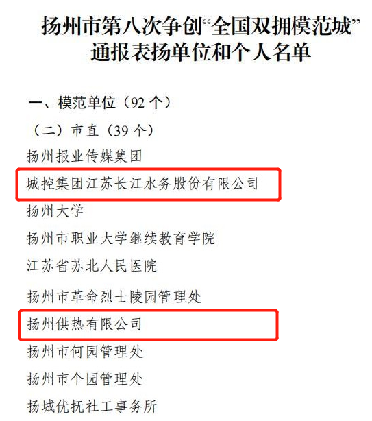 近日,揚州市市委、市政府、軍分區印發《關于表揚第八次爭創“全國雙擁模范城”表現突出單位和個人的通報》,城控集團所屬江蘇長江水務股份有限公司、揚州供熱有限公司兩家單位榮獲爭創“全國雙擁模范城”表現突出單位。
