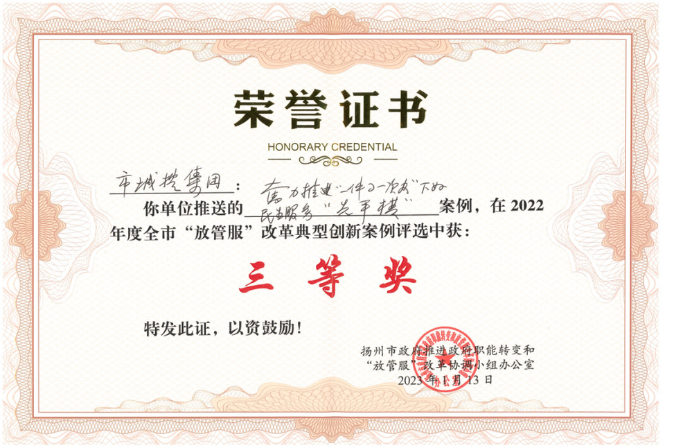 為進一步深化全市“放管服”改革,增強改革意識,激發創新精神,提升政務服務能力,2022年底,市協調辦征集全市47個市級部門(單位)、9個縣(市、區、功能區)“放管服”改革典型創新案例共74 個,經過初審,城控集團選送案例成功入圍決賽。根據評選規則,最終由參選單位以PPT演示方式現場闡述,專家評委組從入圍案例的完整性、創新性、社會價值和成效四個維度進行現場打分,城控集團以92.75分并列第六,獲得三等獎,在十二名入圍單位中是唯一獲獎企業。