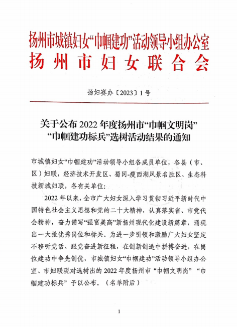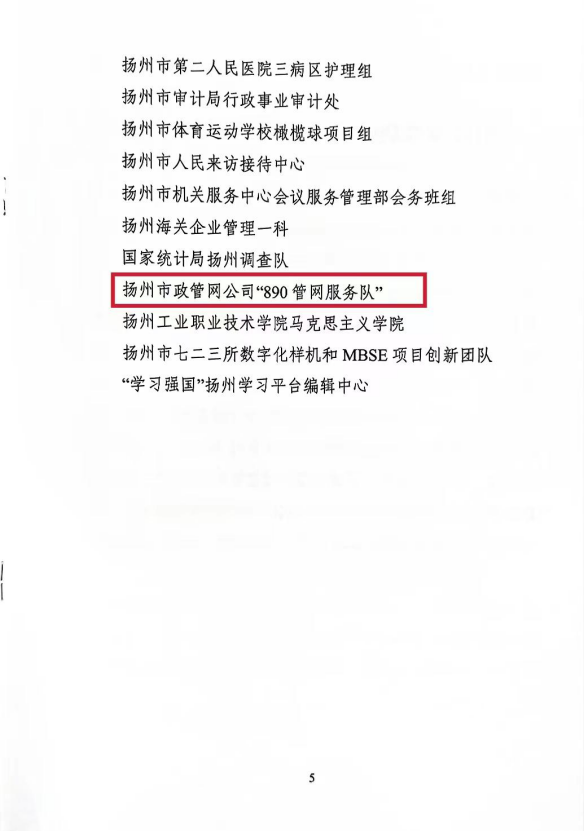 近日,市婦聯、市婦女“巾幗建功”活動領導小組聯合表彰了一批揚州市“巾幗文明崗”和“巾幗建功標兵”。揚州市政管網有限公司“890管網服務隊”榮獲“巾幗文明崗”稱號。