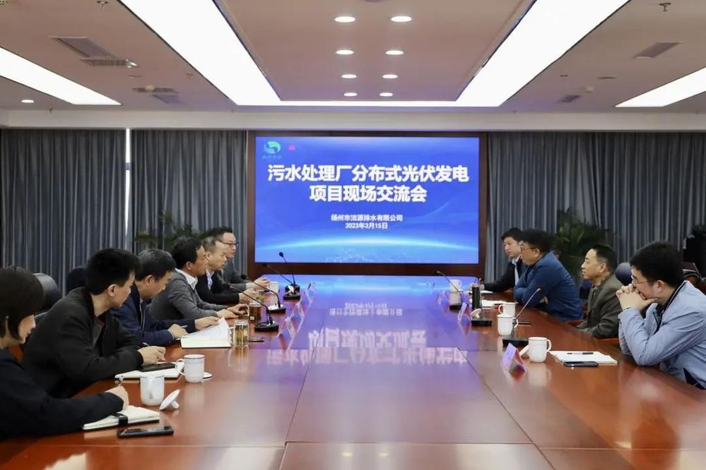 在綜合環保展示廳,潔源排水公司主要負責人詳細介紹了公司發展歷程和污水處理廠光伏發電的建設情況,重點推介了“污水處理—光伏發電—污泥處置—再生水利用”循環經濟產業鏈的運行情況。在交流會上,雙方各自介紹了公司的主要業務情況,重點圍繞污水處理廠的建設和運行、太陽能光伏的實施和收益、水務上市等內容進行了工作交流。