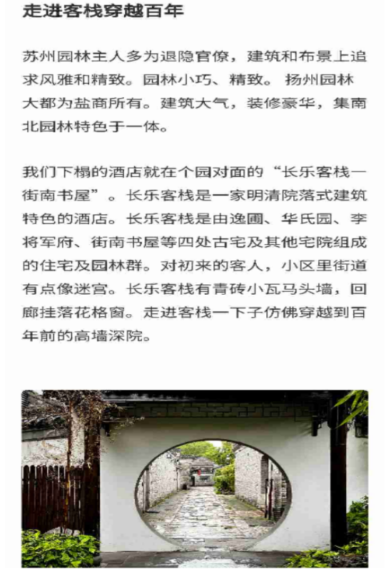 長樂客棧位于中國十大歷史文化名街之一的東關歷史文化街區,占地3.5萬平方米,建筑面積2萬平方米,現有員工140余人,客房130余間(套),是揚州市首家民居式精品文化酒店。通過對酒店區域內逸圃(民國初年錢業經紀人李鶴生老宅)、街南書屋(馬氏鹽商的住宅)、李長樂故居(清代名將李長樂將軍府)、華氏園(清末民初鹽商華友梅老宅)等名人故居、古建老宅等空間載體的保護修復,在充分體現了揚州園林因地制宜、參差自然、巧于因借、步移景異等藝術特點的同時,讓古城歷史文化遺跡煥發出新的生機和活力,成為我市推進古城整體保護、有機更新和活化利用的優秀案例。