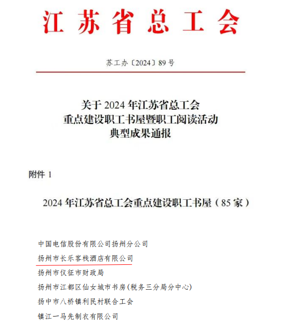 近日,江蘇省總工會發布重點建設職工書屋暨職工閱讀活動典型成果通報,揚州市長樂客棧酒店榮獲“2024年江蘇省總工會重點建設職工書屋”稱號。