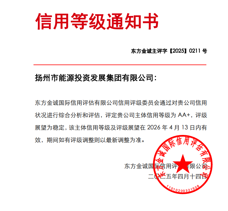此次獲AA+主體信用評級,充分體現了能源集團優異的資產質量、穩健的財務結構和強勁的現金流管理能力。能源集團將繼續以市場化為導向,做強做優做大燃氣、供熱、新能源、“雙碳”核心業務,為推動揚州市能源轉型和綠色發展貢獻更大力量。