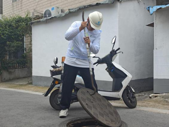“夏季巡查必須趕早,避開中午最熱時段?!薄?0”后潘玥昕邊說邊麻利地打開第一個檢查井。井蓋掀開的瞬間,井蓋下的熱浪夾雜著刺鼻的氣味撲面而來,但他早已習以為常。上午10點,地表溫度已突破40℃。他們的工作服濕了又干、干了又濕,早已結出一層白色的鹽漬。