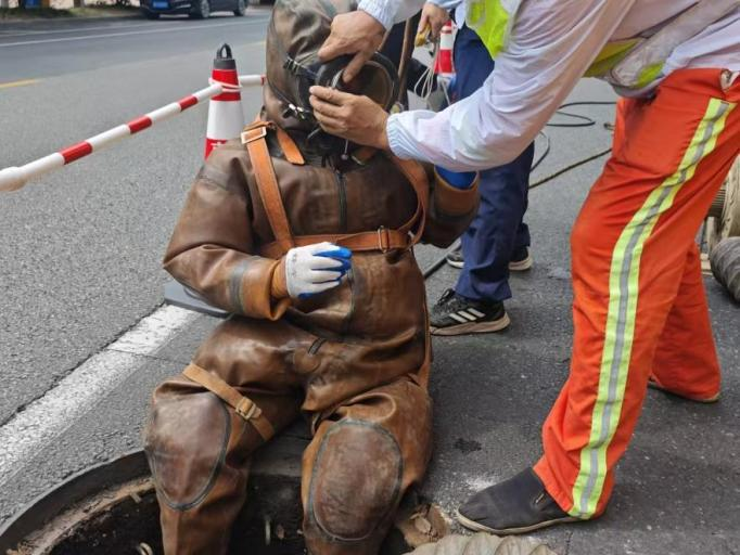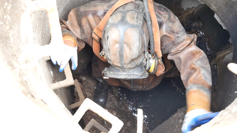 對于井室和管道內存在的大塊水泥和混凝土,常規方法難以清除,只能通過人工下井清掏。穿上厚重的防護服、戴上防毒面具、系好安全繩,相榮慢慢降入井中。管道內悶熱潮濕、空氣混濁。“井下溫度比地面還高,像蒸桑拿?!痹谥睆絻H700mm的井室內,相榮用風鎬將水泥塊打碎,并用小桶將打碎的水泥碎塊裝進去,再由井上面的輔助人員一桶一桶的拎上來,并及時裝入垃圾袋,當天集中清運。經過兩個小時的奮戰,他們終于疏通了這段兩米多長的堵塞管道。當相榮被上面兩個輔助人員通過三腳架及安全繩拉上來時,汗水濕透了他的衣服。