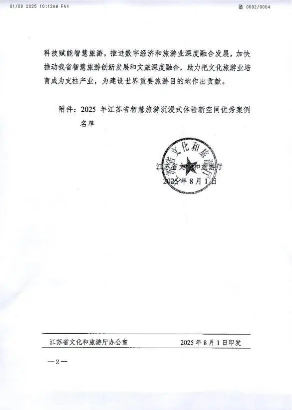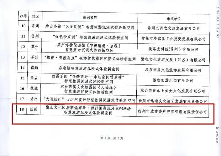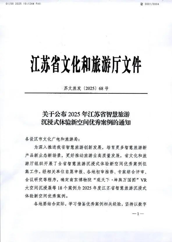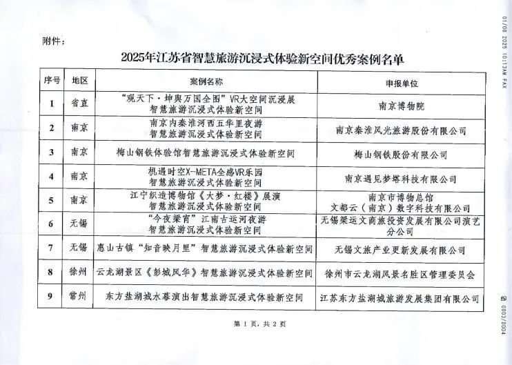 在近日江蘇省文化和旅游廳公布的《2025年江蘇省智慧旅游沉浸式體驗新空間優秀案例名單》中,揚州《唐朝詭事錄·西行》國潮沉浸劇場與南京博物院“觀天下·坤輿萬國圖”VR大空間沉浸展等18個案例共同被評選為2025年江蘇省智慧旅游沉浸式體驗新空間優秀案例。