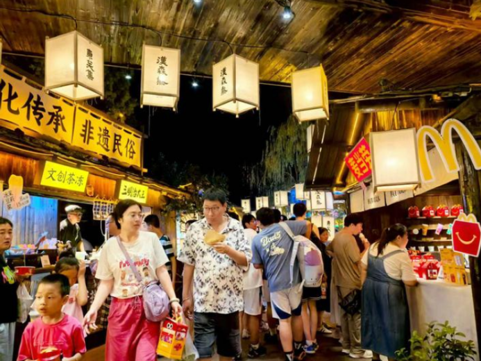 露天啤酒花園內,精釀啤酒與揚州老鵝、臭干等本地小吃組成奇妙CP,引得游客紛紛駐足。當夜幕降臨,千米長的東關街燈火通明,“千里照壁燈”景觀與啤酒節的璀璨燈光交相輝映,真正實現“晝夜皆景、越夜越美”的消費新格局。