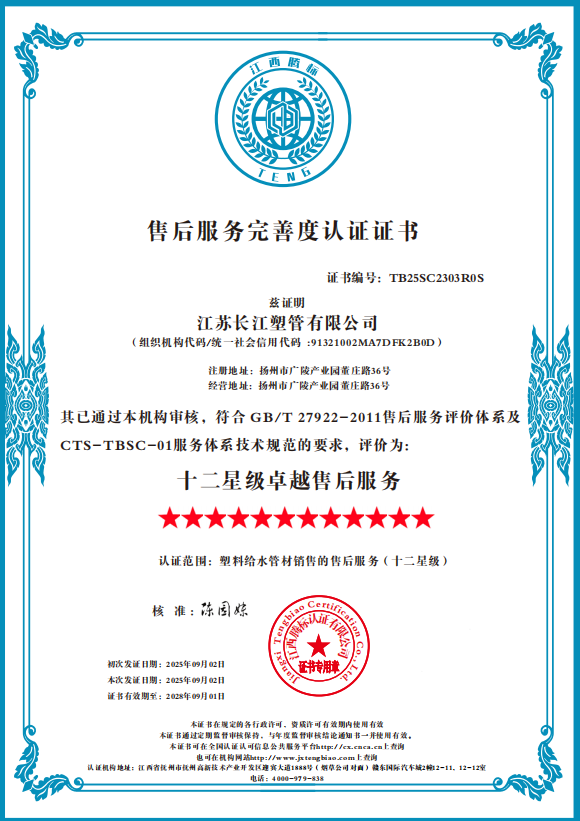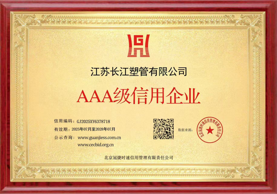 2025年,江蘇長江塑管有限公司接連榮獲AAA級信用企業蟬聯認證與十二星級卓越售后服務評價。這兩項沉甸甸的榮譽,不僅是國家權威機構的高度認可,更是企業全體員工在生產一線以汗水與擔當書寫的奮斗答卷。