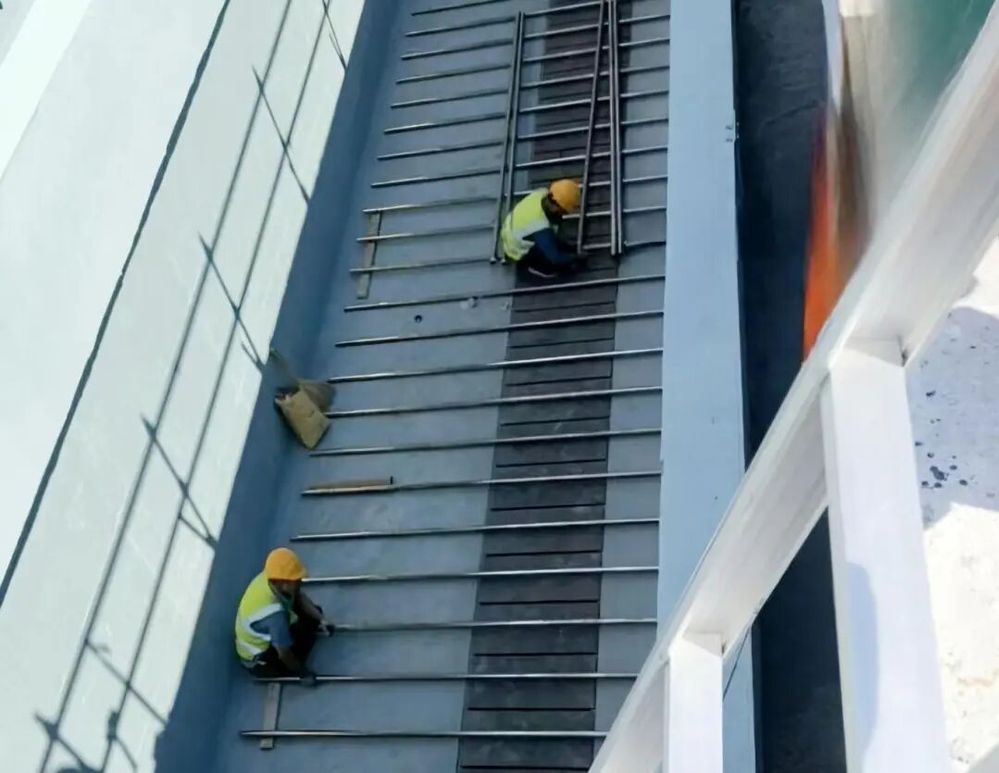 在生物反應池作業面上,正在進行火燒板貼面安裝的黃師傅是眾多堅守者中的一員。黃師傅說“為了搶進度,除了中秋節下午放了半天假,整個假期我們都在工地上”。工地每天清晨5點半開始運轉,施工人員到崗后首先參加安全例會和班前教育,明確當日任務后,便立即投入緊張作業。這份堅守,不僅體現了建設者對崗位的盡責,更寄托著對項目早日建成投運的期盼。
